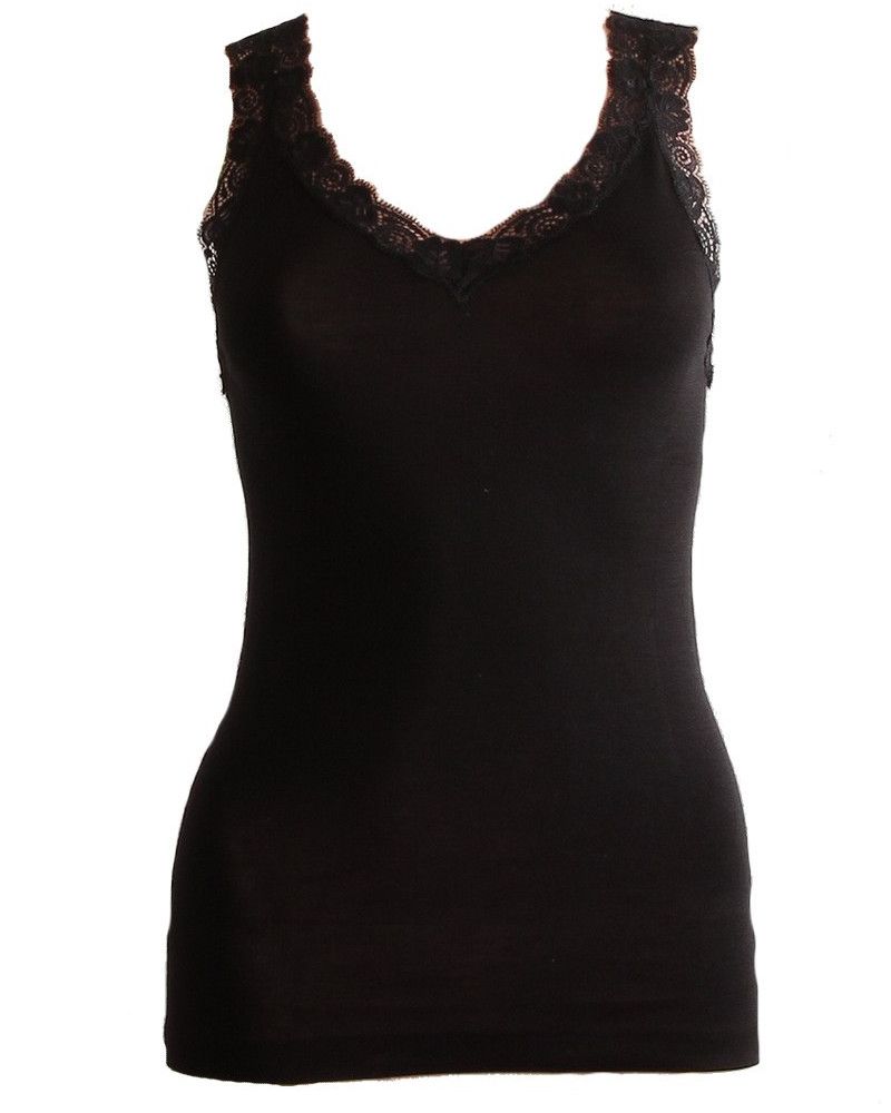 Una camiseta sin mangas de lana y seda hecha en Italia con un escote adornado con un delicado encaje Leavers para una comodidad óptima y una estética refinada.