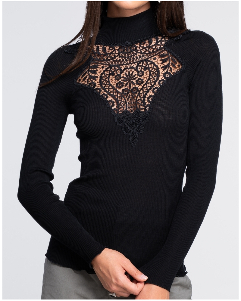 Top à col roulé côtelé laine et soie macramé Oscalito 7608 (Noir)